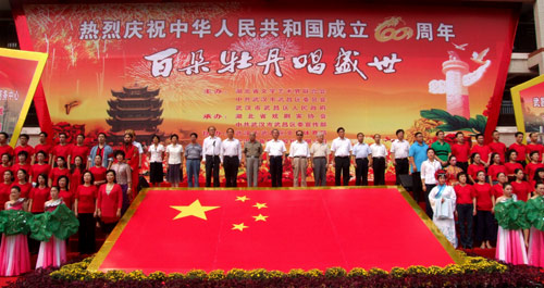 曲調悠揚、歌唱深情、舞姿絢麗,2009年9月12日下午由湖北省文聯(lián)和湖北省戲劇家協(xié)會聯(lián)合主辦的“隆重慶祝中華人民共和國建國60周年——百朵牡丹唱盛世”文藝演出在董必武先生于1920年創(chuàng)立的具有紅色傳統(tǒng)的名校武漢中學新校區(qū)體育場舉行。湖北省文聯(lián)、湖北省文化廳以及武昌區(qū)委、區(qū)政府有關領導和四千多名群眾一起觀看了演出。