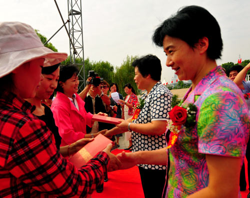 省人大副主任蔣大國(guó)(左二)、省婦聯(lián)主席梁惠玲(左一)給榮獲一等獎(jiǎng)作者頒獎(jiǎng)