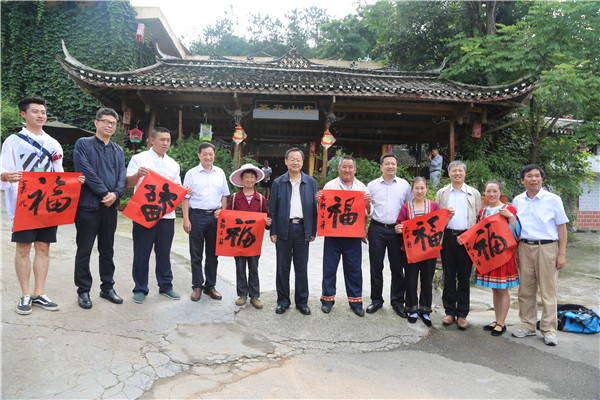 2016年6月28日上午,中國文聯(lián)文藝志愿團(tuán)“送歡樂下基層”走進(jìn)恩施芭蕉,文藝小分隊走訪農(nóng)家,在楓香坡侗族寨為村民送福字