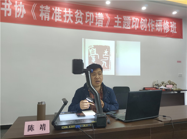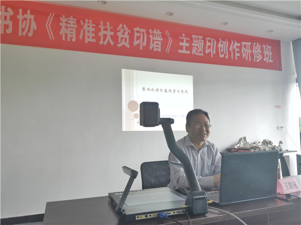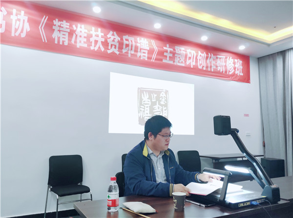 據(jù)悉,此次研修班以“堅(jiān)決打好脫貧攻堅(jiān)戰(zhàn)”為主題圍繞著主題印創(chuàng)作列出“宏觀戰(zhàn)略”、“偉大愿景”、“精準(zhǔn)措施”、“拓展視野”四個(gè)方面,對(duì)國(guó)家戰(zhàn)略打響脫貧攻堅(jiān)戰(zhàn)的關(guān)鍵詞進(jìn)行了詳細(xì)的梳理和濃縮,列出了一百三十余個(gè)關(guān)鍵詞。將以此內(nèi)容為基礎(chǔ)打造一部《精準(zhǔn)扶貧印譜》,填補(bǔ)我省篆刻專題印譜空白。并舉辦《精準(zhǔn)扶貧印譜》篆刻展,展覽的印屏將捐贈(zèng)給大悟縣陳河村和鄂北文化驛站,成為其永久藝術(shù)展,增加其文藝美譽(yù)度和人文內(nèi)涵,助理陳河村脫貧致富,打造環(huán)境美、文藝美的人文鄉(xiāng)村。中國(guó)書法家協(xié)會(huì)主席蘇士澍為《精準(zhǔn)扶貧印譜》題寫書名。