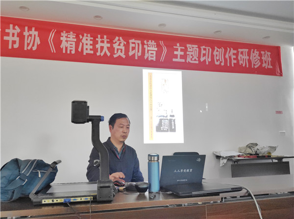 省文聯(lián)黨組成員、副主席羅丹青指出,此次研修班是省文聯(lián)和省書協(xié)經(jīng)過(guò)研究舉辦的一次專題培訓(xùn)。此次培訓(xùn)圍繞精準(zhǔn)扶貧這一當(dāng)前熱點(diǎn)主題,并結(jié)合即將到來(lái)的全國(guó)第十二屆書法篆刻作品展,進(jìn)行集中封閉培訓(xùn)。這不僅僅是一次簡(jiǎn)單的篆刻創(chuàng)作,更是希望通過(guò)此次培訓(xùn),開(kāi)拓各位藝術(shù)家的思想眼界,打通時(shí)政熱點(diǎn)和藝術(shù)創(chuàng)作的瓶頸,通過(guò)培訓(xùn)力爭(zhēng)打造一批沖刺國(guó)展的藝術(shù)精品。此次培訓(xùn)從4月16日-22日為期7天,邀請(qǐng)到中國(guó)書法家協(xié)會(huì)理事、中國(guó)書法家協(xié)會(huì)篆書委員會(huì)副主任、西泠印社理事、河南省書協(xié)副主席許雄志老師,中國(guó)書法家協(xié)會(huì)篆刻委員會(huì)委員、西泠印社社員、山東省書協(xié)副主席陳靖老師,中共湖北省委黨校經(jīng)濟(jì)學(xué)與經(jīng)濟(jì)管理教研部主任王能應(yīng)教授為學(xué)員圍繞主題印文本策劃、印稿設(shè)計(jì)、邊款處理等內(nèi)容進(jìn)行授課。期間還安排了省內(nèi)桂建明、程遲生、葉青峰、魏曉偉、李默等篆刻藝術(shù)家就個(gè)人篆刻心得進(jìn)行分享。
