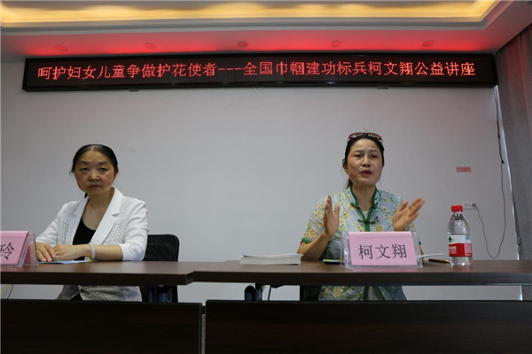 在鄂北文化驛站多功能廳,從鎮(zhèn)上、村里趕來聽課的留守婦女及兒童近百人,專心致志聆聽全國(guó)巾幗建功標(biāo)兵柯文翔主講題為《呵護(hù)婦女兒童 爭(zhēng)做護(hù)花使者》的安全自護(hù)課。