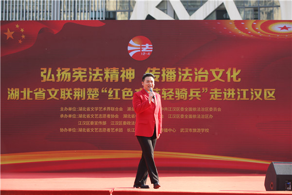 在全國法治宣傳日暨第六個國家憲法日之際,12月4日下午,湖北省文聯(lián)、湖北省演藝集團(tuán)、中共江漢區(qū)委全面依法治區(qū)委員會在武漢市旅游學(xué)校共同舉辦了省文聯(lián)荊楚“紅色文藝輕騎兵”走進(jìn)江漢區(qū)法治宣傳文藝演出活動,用文藝的形式弘揚憲法精神,傳播法治文化。