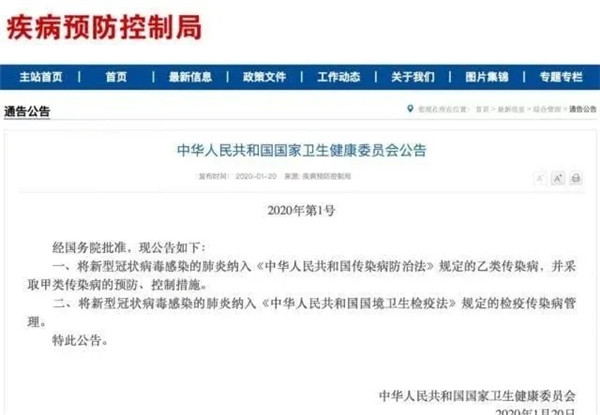 1月20日,國家衛(wèi)健委發(fā)布2020年1號公告,將新型冠狀病毒感染的肺炎納入《中華人民共和國傳染病防治法》規(guī)定的乙類傳染病并采取甲類傳染病的預(yù)防、控制措施。
