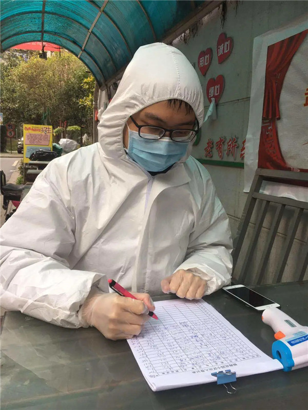 省文聯(lián)“黨員進(jìn)社區(qū)工作隊(duì)”隊(duì)員鄭毅在涂家?guī)X社區(qū)登記出入人員信息