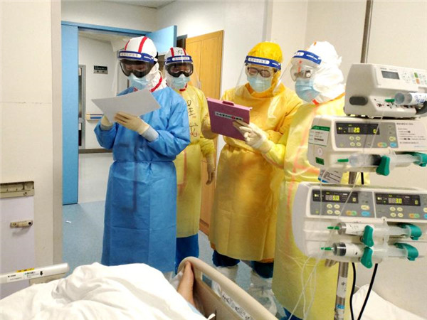 2月11日,在武漢同濟(jì)醫(yī)院中法新城院區(qū)ICU病房內(nèi),來自北京協(xié)和醫(yī)院的醫(yī)護(hù)人員在病床旁查房交班。