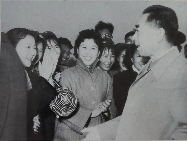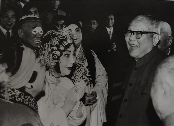 1958年4月5日,周恩來總理在武漢接見漢劇表演藝術(shù)家陳伯華(左)、京劇表演藝術(shù)家楊菊萍(中) (黃克勤 攝)