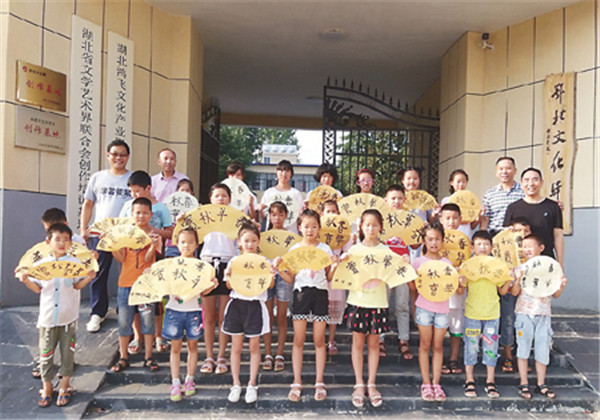 湖北省文聯(lián)在駐點(diǎn)扶貧村建設(shè)的“鄂北文化驛站”培訓(xùn)留守兒童書(shū)法