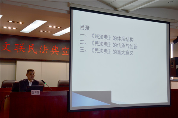 為深入學(xué)習(xí)宣傳民法典,切實推動民法典實施,2020年11月12日上午,省文聯(lián)在十樓會議室舉辦了學(xué)習(xí)《民法典》宣講報告會。報告會邀請了省委講師團成員、武漢大學(xué)法學(xué)院教授,博士生導(dǎo)師張善斌作宣講報告,省文聯(lián)黨組成員、副主席馬尚云主持會議,省文聯(lián)黨組成員、副主席肖偉池,黨組成員、副主席王永平,二級巡視員吳秋宏出席會議,省文聯(lián)全體干部職工、今古傳奇?zhèn)髅郊瘓F各企業(yè)負(fù)責(zé)人和國畫院負(fù)責(zé)人代表80余人參加了學(xué)習(xí)。