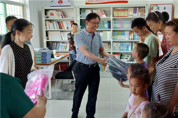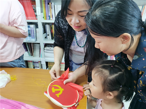 6月1日上午,王永平一行來(lái)到陳河村新時(shí)代文明實(shí)踐站,與陳河村兒童及鄉(xiāng)親們交流互動(dòng)。在擁有6000余冊(cè)藏書(shū)的陳河村圖書(shū)室兒童閱讀角,大家一起高唱“唱支山歌給黨聽(tīng)”,王永平等領(lǐng)導(dǎo)為陳河村少年兒童講紅色故事送書(shū)包文具,民間藝術(shù)家們手把手教少年兒童繡制黨旗,從小培養(yǎng)他們刺繡興趣愛(ài)好,讓他們?cè)谟仔〉男撵`里種下愛(ài)黨愛(ài)國(guó)的種子。