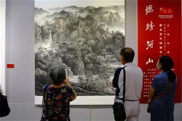 展覽以慶祝中國共產(chǎn)黨成立100周年為主題,分為“光輝歷程”“錦繡河山”“百花向陽”三個展覽單元,共展出127位湖北當?shù)刂袊嫯嫾业木妨ψ?,人物作品描繪了黨史上的多個重要人物和重大事件,山水、花鳥等題材的作品既傳承了傳統(tǒng)繪畫技法,又融合了多種當代風格的探索,展現(xiàn)了富有荊楚特色的中國畫創(chuàng)作新風貌,吸引不少中國畫愛好者前來觀展。