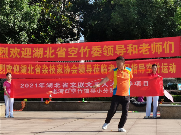 老河口市雖然是一個縣級市,但是有兩支空竹隊伍,一百多位空竹會員,是我省縣市區(qū)里空竹會員最多的城市。應(yīng)老河口市空竹會員的要求,省文聯(lián)文學(xué)藝術(shù)院、省雜協(xié)邀請了省雜協(xié)空竹運動委員會的鄧格生、黃文勝、李翠華等國內(nèi)有一定知名度的空竹教練,成立了“湖北雜技(空竹)老河口輔導(dǎo)小分隊”,赴老河口開展為期四天的空竹輔導(dǎo)培訓(xùn)工作。