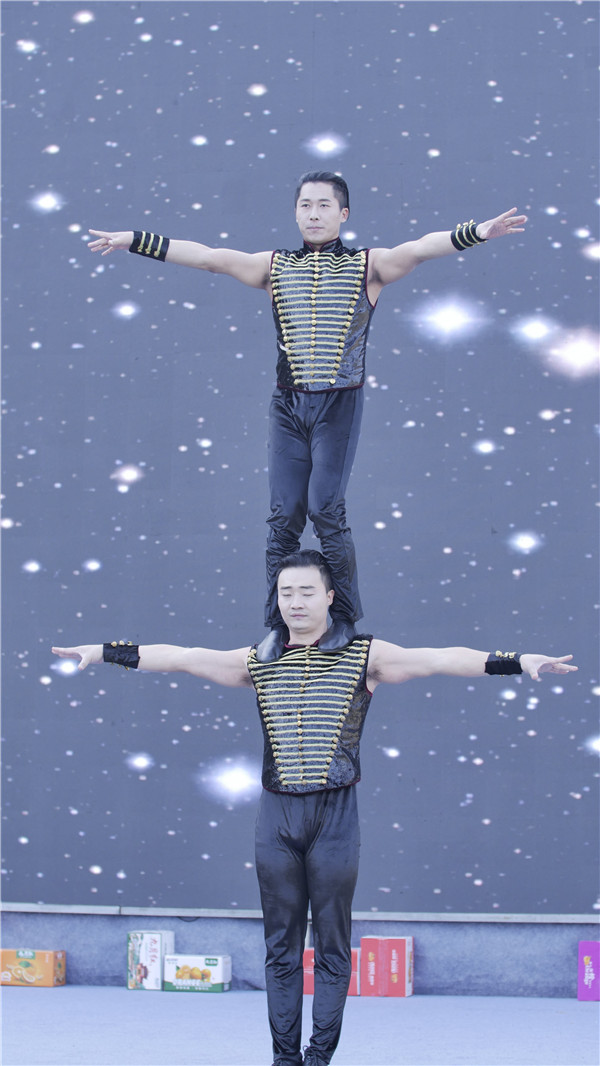 青年雜技演員李華清、陳晨表演雜技《力量》