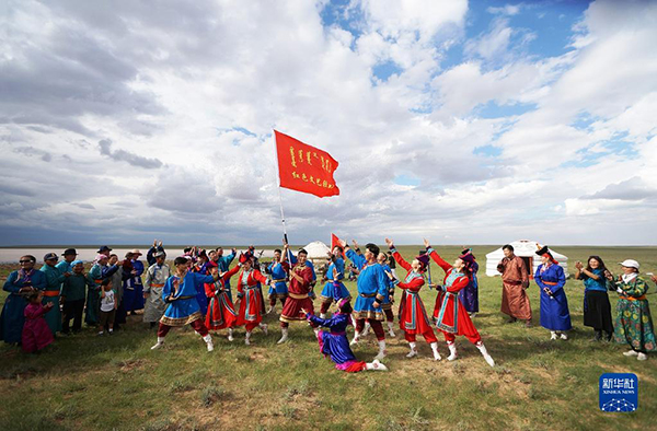 2018年8月22日,內(nèi)蒙古蘇尼特右旗烏蘭牧騎隊員在牧區(qū)演出。新華社發(fā)(東哈達(dá)攝)
