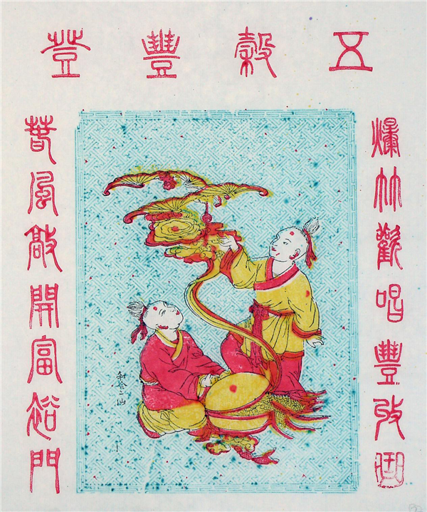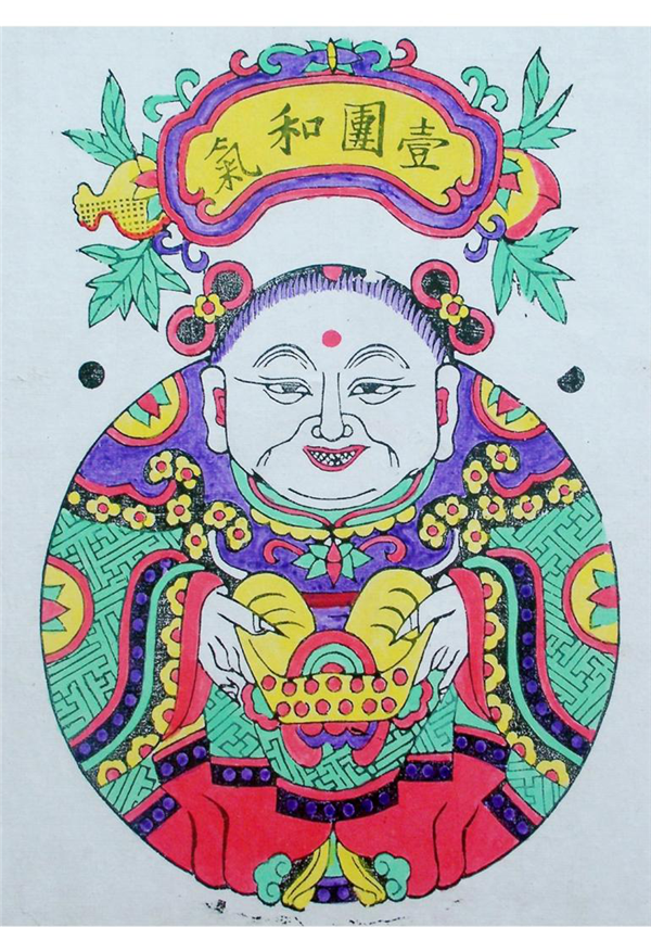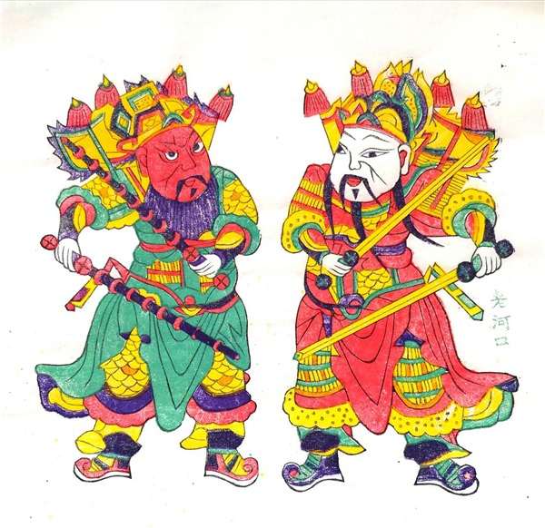 老河口木版年畫,是我國民間傳統(tǒng)美術(shù)的優(yōu)秀代表。其內(nèi)容多取材于歷史戲劇、傳說故事,構(gòu)圖飽滿有層次,雕工精細(xì)流暢,線條粗獷有力,顏色豐富而對比鮮明,人物造型生動夸張,神形兼?zhèn)洹F湓⒁饧橄矐c的作品有:《門神》《和合二仙》《一團(tuán)和氣》等。