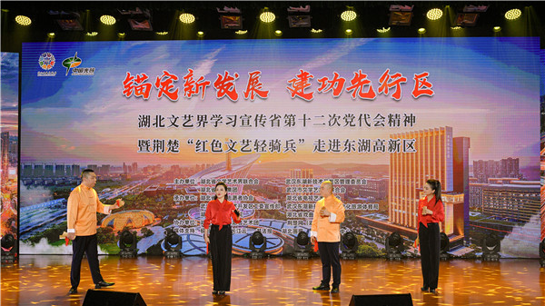 7月14日晚,“錨定新發(fā)展 建功先行區(qū)”湖北文藝界學(xué)習(xí)宣傳省第十二次黨代會(huì)精神暨荊楚“紅色文藝輕騎兵”走進(jìn)武漢東湖高新區(qū)文藝惠民演出在武漢高農(nóng)生物園會(huì)展中心禮堂上演。此次演出的大部分節(jié)目,都是圍繞習(xí)近平總書(shū)記考察湖北,以及省第十二次黨代會(huì)精神創(chuàng)作,湖北文藝志愿者們與東湖高新區(qū)的奮斗者們用十余個(gè)精心編排,不同類型的節(jié)目為大家在新時(shí)代的明天吶喊助威。