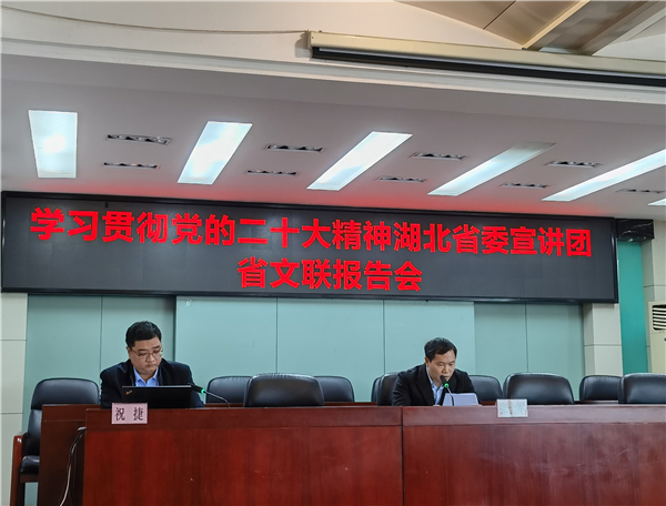 11月18日上午,省文聯(lián)舉辦學(xué)習(xí)貫徹黨的二十大精神宣講報(bào)告會(huì),省委宣講團(tuán)成員,武漢大學(xué)法學(xué)院副院長(zhǎng)、教授、博士生導(dǎo)師祝捷作宣講報(bào)告。會(huì)議由省文聯(lián)黨組書記、常務(wù)副主席張士軍同志主持,黨組成員、副主席、一級(jí)巡視員肖偉池,黨組成員、副主席王永平出席。省文聯(lián)機(jī)關(guān)、協(xié)會(huì)、文學(xué)藝術(shù)院干部職工,今古傳奇?zhèn)髅郊瘓F(tuán)各企業(yè)負(fù)責(zé)人共70余人在現(xiàn)場(chǎng)參加會(huì)議,省文聯(lián)業(yè)務(wù)主管社會(huì)組織黨支部書記、委員通過(guò)騰訊會(huì)議收聽(tīng)收看報(bào)告會(huì)。