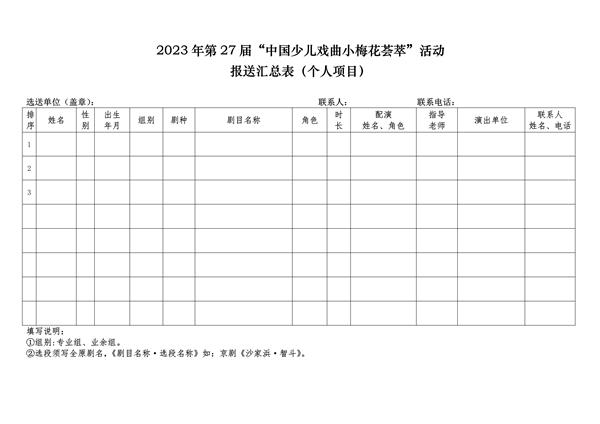 2023年第27屆“中國(guó)少兒戲曲小梅花薈萃”活動(dòng)報(bào)送匯總表(個(gè)人項(xiàng)目).doc