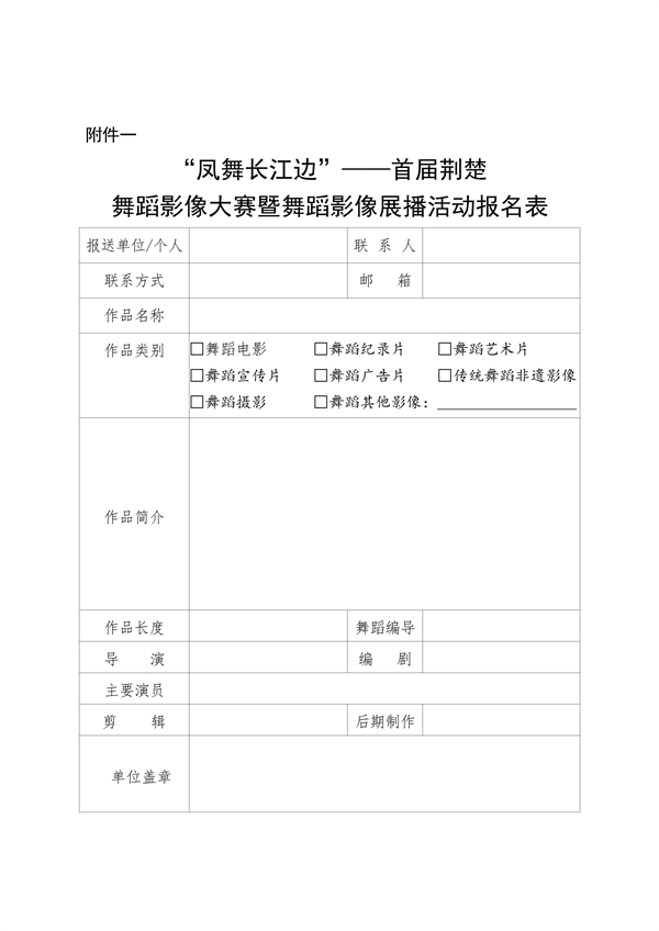 附件一:2023 年“鳳舞長(zhǎng)江邊”——首屆荊楚舞蹈影像大賽暨舞蹈影像展播活動(dòng)報(bào)名表.doc