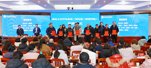 李悅、胡興共同為湖北文藝評(píng)論基地(湖北第二師范學(xué)院)揭牌并為基地聘請(qǐng)的工作委員會(huì)委員頒發(fā)了聘書。李幼平宣讀了《關(guān)于在湖北第二師范學(xué)院成立湖北文藝評(píng)論基地的決定》,劉波宣讀了《關(guān)于聘任湖北文藝評(píng)論基地(湖北第二師范學(xué)院)工作委員會(huì)組成人員的決定》,庫(kù)文靜代表湖北文藝評(píng)論基地(湖北第二師范學(xué)院)作了發(fā)言。