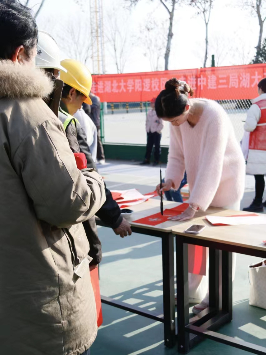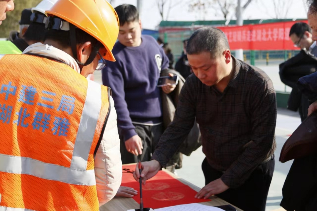 無聯(lián)不成春,有聯(lián)春意濃。1月13日下午,湖北省文聯(lián)荊楚“紅色文藝輕騎兵”迎新春送春聯(lián)活動在湖北大學(xué)陽邏校區(qū)和中建三局湖大產(chǎn)教融合項目部火熱開展,湖北省文聯(lián)和省中小學(xué)教師書協(xié)特邀6位書法家為教師職工、中建三局產(chǎn)業(yè)工人、若城社區(qū)居民家屬書寫新春祝福。
