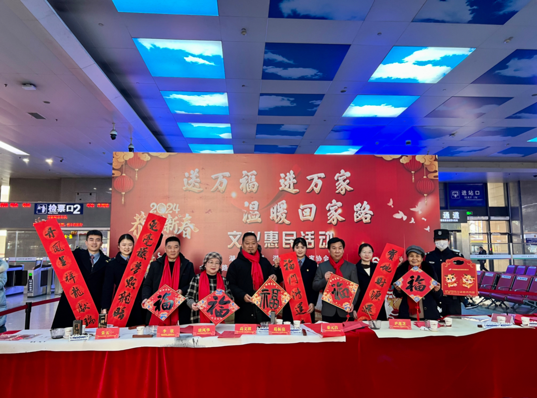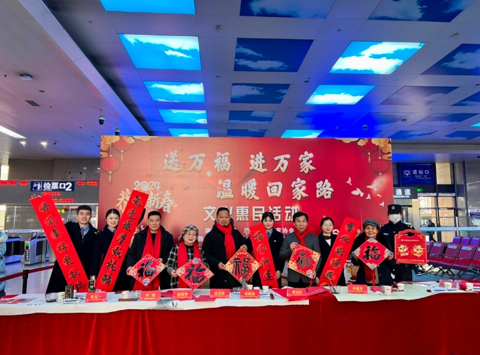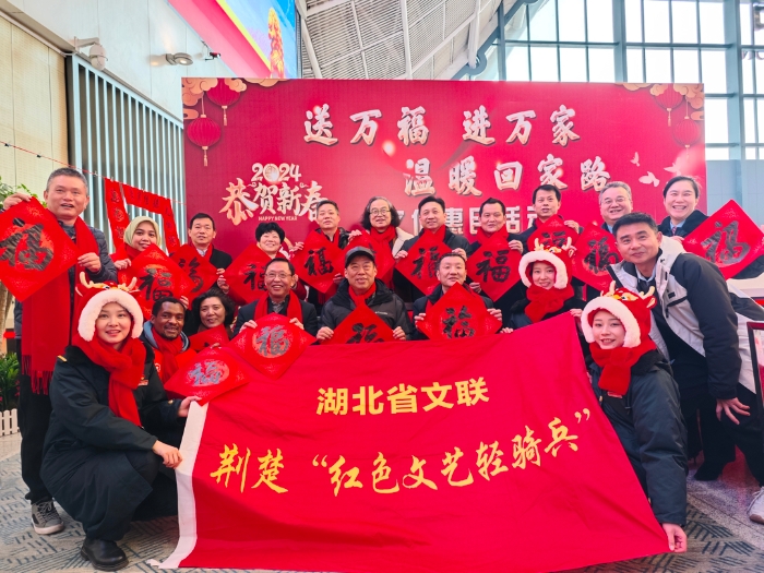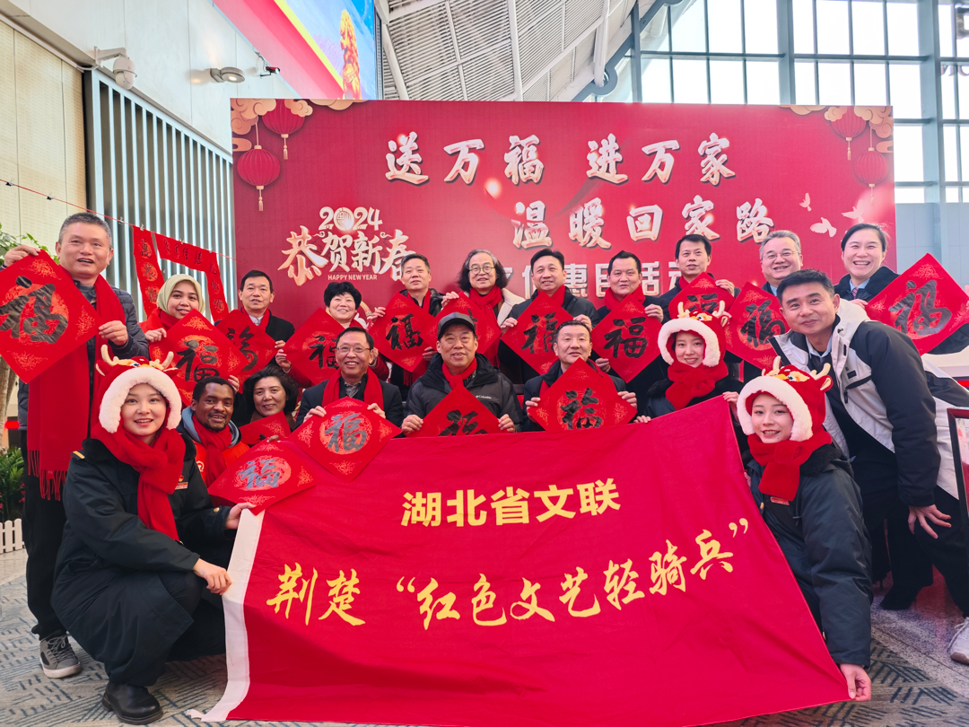 1月27日,在新春佳節(jié)來臨之際?!八腿f福進萬家 溫暖回家路”湖北省文聯(lián)荊楚“紅色文藝輕騎兵”文藝惠民系列活動在武漢市漢口站、武漢站、武昌站火熱開展,省文聯(lián)黨組成員、副主席王永平,省文聯(lián)黨組成員、秘書長張海旺,中國鐵路武漢局宣傳部副部長曾連平出席此次活動。