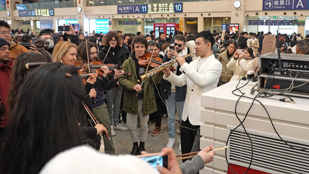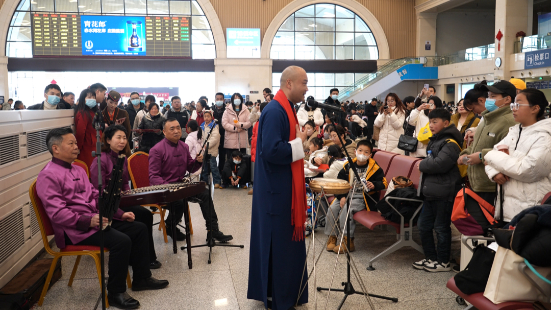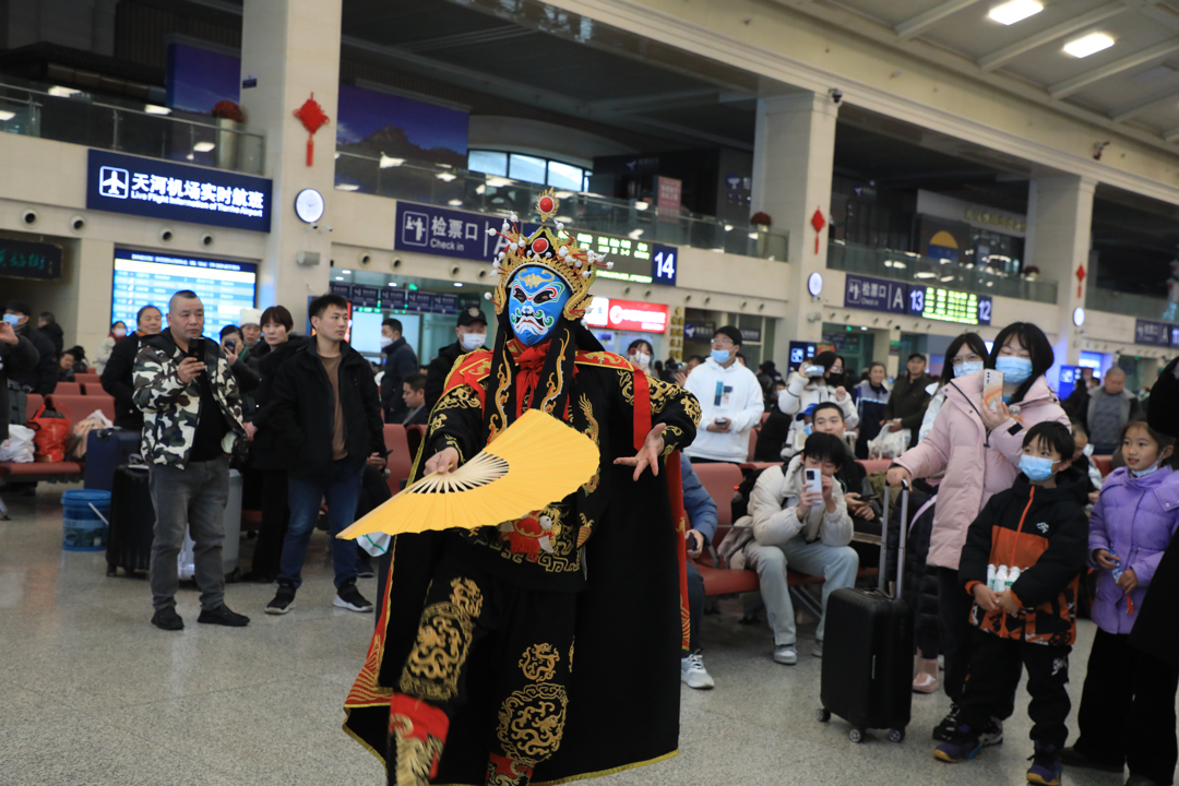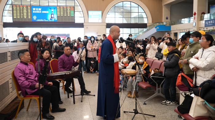 本次活動還在漢口火車站開展了一場別開生面的文藝惠民演出,特邀省內(nèi)知名藝術家徐寧、朱睿淇、蔡鑫、劉琴、吳松濤、胡啟文為漢口站的廣大旅客們帶來湖北大鼓、器樂合奏、魔術、川劇變臉等精彩節(jié)目?;顒蝇F(xiàn)場人聲鼎沸氣氛非常熱烈,旅客們或坐位子或坐行李或坐地上,叫好聲、歡呼聲如浪潮般翻涌,藝術家們也紛紛走下舞臺,與現(xiàn)場觀眾互動,神秘莫測的魔術、變臉最受孩子們的歡迎,地道幽默的湖北大鼓讓不少歸鄉(xiāng)旅客笑中有淚。演出籌備期間,正在調(diào)試樂器的藝術家們還吸引了一支特別的隊伍,這支來自意大利的科莫湖畔交響樂隊被現(xiàn)場濃厚的中國傳統(tǒng)文化氛圍所感染,熱切地表示想要加入合奏,一首《友誼天長地久》和《茉莉花》收獲了大量的贊揚與掌聲,音樂無國界,這場別開生面的器樂合奏用音樂的語言進行著中外文化交流。