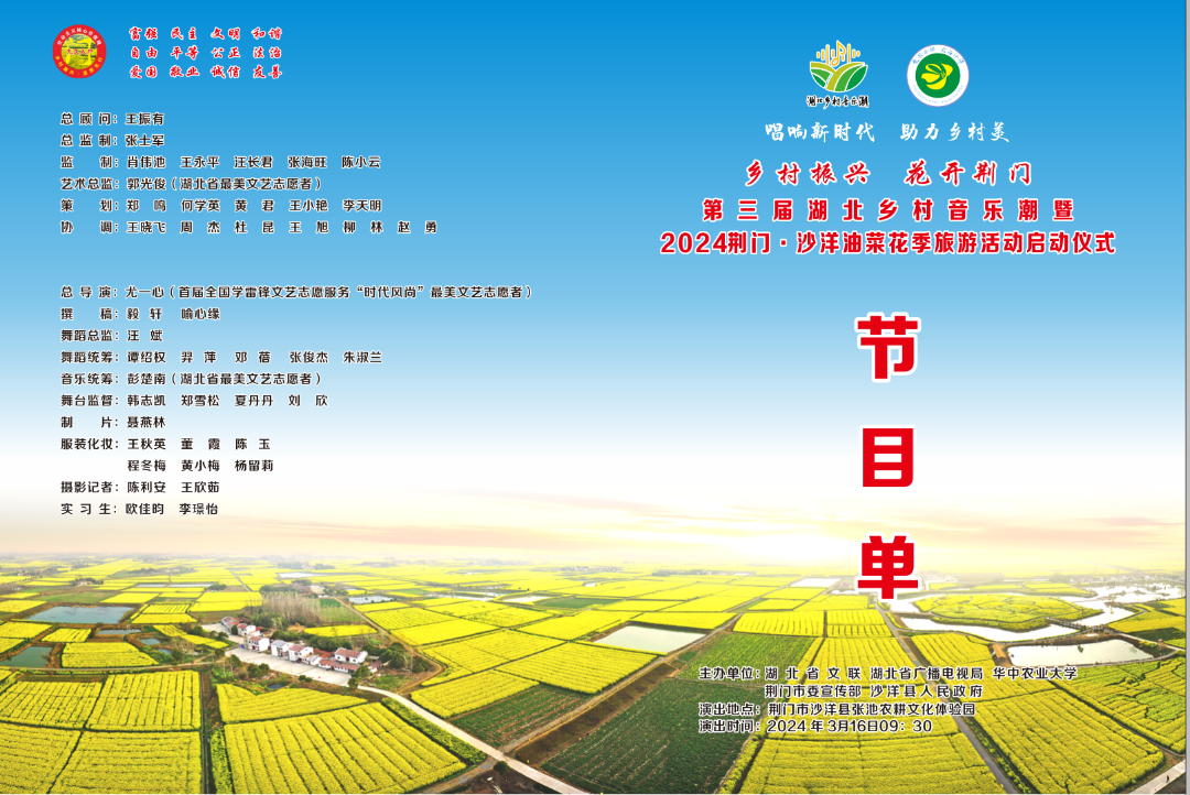 本場活動由湖北省文學藝術(shù)界聯(lián)合會、湖北省廣播電視局、中共荊門市委宣傳部、中共沙洋縣委、沙洋縣人民政府主辦,湖北省旅游文化發(fā)展促進會、湖北省文藝志愿者協(xié)會、湖北省音樂家協(xié)會、湖北省攝影家協(xié)會 、湖北省電視藝術(shù)家協(xié)會、湖北省花木協(xié)會、荊門市文學藝術(shù)界聯(lián)合會荊門市文化和旅游局、荊門市農(nóng)業(yè)農(nóng)村局、荊門市鄉(xiāng)村振興局、中共沙洋縣委宣傳部共同承辦。