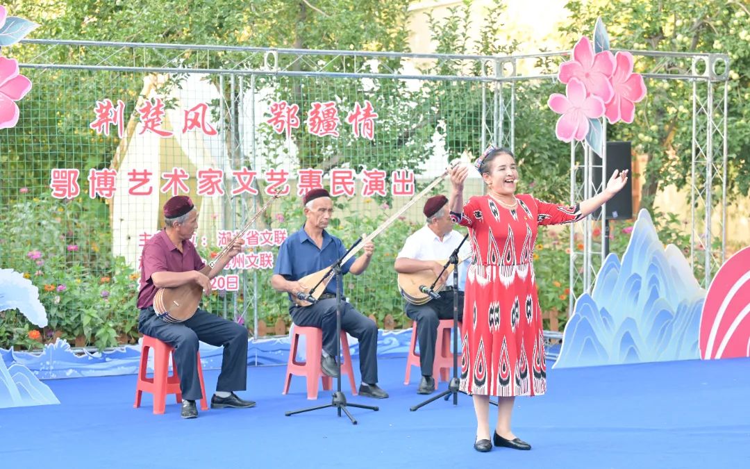展覽開幕式后,還組織了荊楚“紅色文藝輕騎兵”走進博州文藝宣講惠民演出暨湖北民族舞蹈培訓成果展演。本地藝術家們也進行了交流演出。蘇和、美登表演了馬頭琴合奏《萬馬奔騰》《草原連著北京》,巴合提古麗帶來哈薩克民歌獨唱《瑪依拉變奏曲》,吉布曾、巴音花、賽爾格表演女聲三人小合唱《我和草原有個約定》;在博樂市阿里翁白新村,博樂市歌舞團加爾肯表演了冬布拉彈唱《美麗的姑娘》,維吾爾族清泉樂隊表演歌曲《感謝親愛的共產(chǎn)黨》,博州天賜草原藝術團演奏、博州青年歌手道其其格、金花、阿亞烏樂演唱《相聚博爾塔拉》。