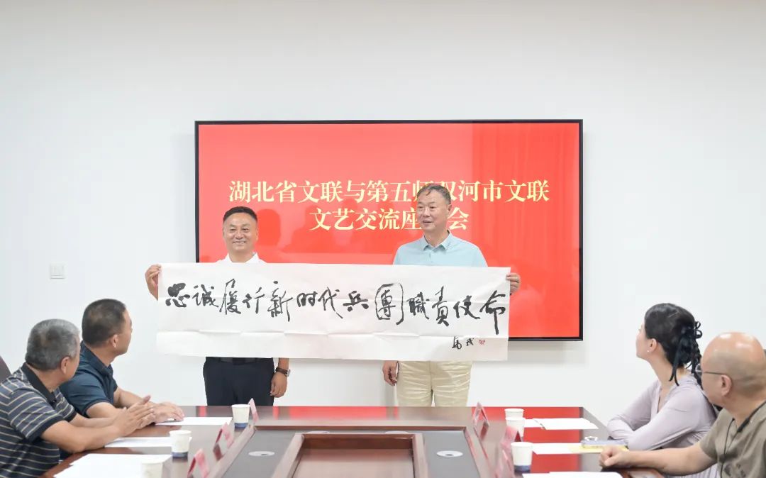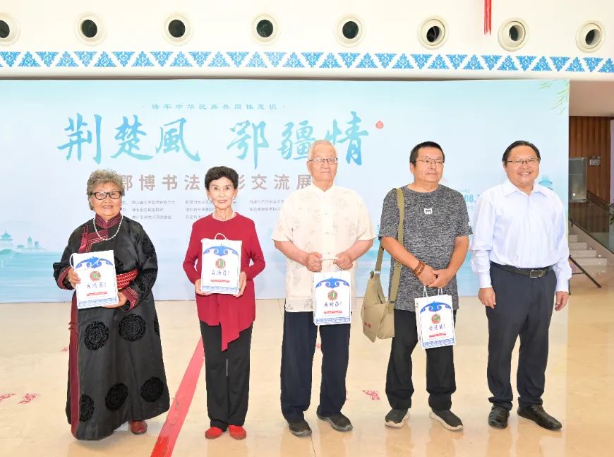 演出過程中,湖北省文聯(lián)黨組成員、副主席馬尚云慰問了博州4位老藝術家,并向他們贈送了湖北文創(chuàng)產(chǎn)品。在鄂博民間文藝創(chuàng)作基地、鄂博書法繪畫創(chuàng)作基地、兵團農(nóng)五師雙河市文聯(lián),湖北書法家與博州書法家們現(xiàn)場揮毫,“鄂博絲路情”“崇德尚藝”等現(xiàn)場創(chuàng)作的書法作品,表達了兩地文藝家和湖北新疆人民水乳交融的深厚情感。湖北書法家根據(jù)五師雙河市歷史文化特色書寫了15幅書畫作品,師市文聯(lián)主席孫鋒代表文聯(lián)接受了贈送。湖北大學藝術與設計學院教授李碧紅、湖北省美協(xié)副秘書長張展捐贈了3幅美術精品,湖北攝影家趙妤、丁俊杰用鏡頭記錄下博州的無限風光。