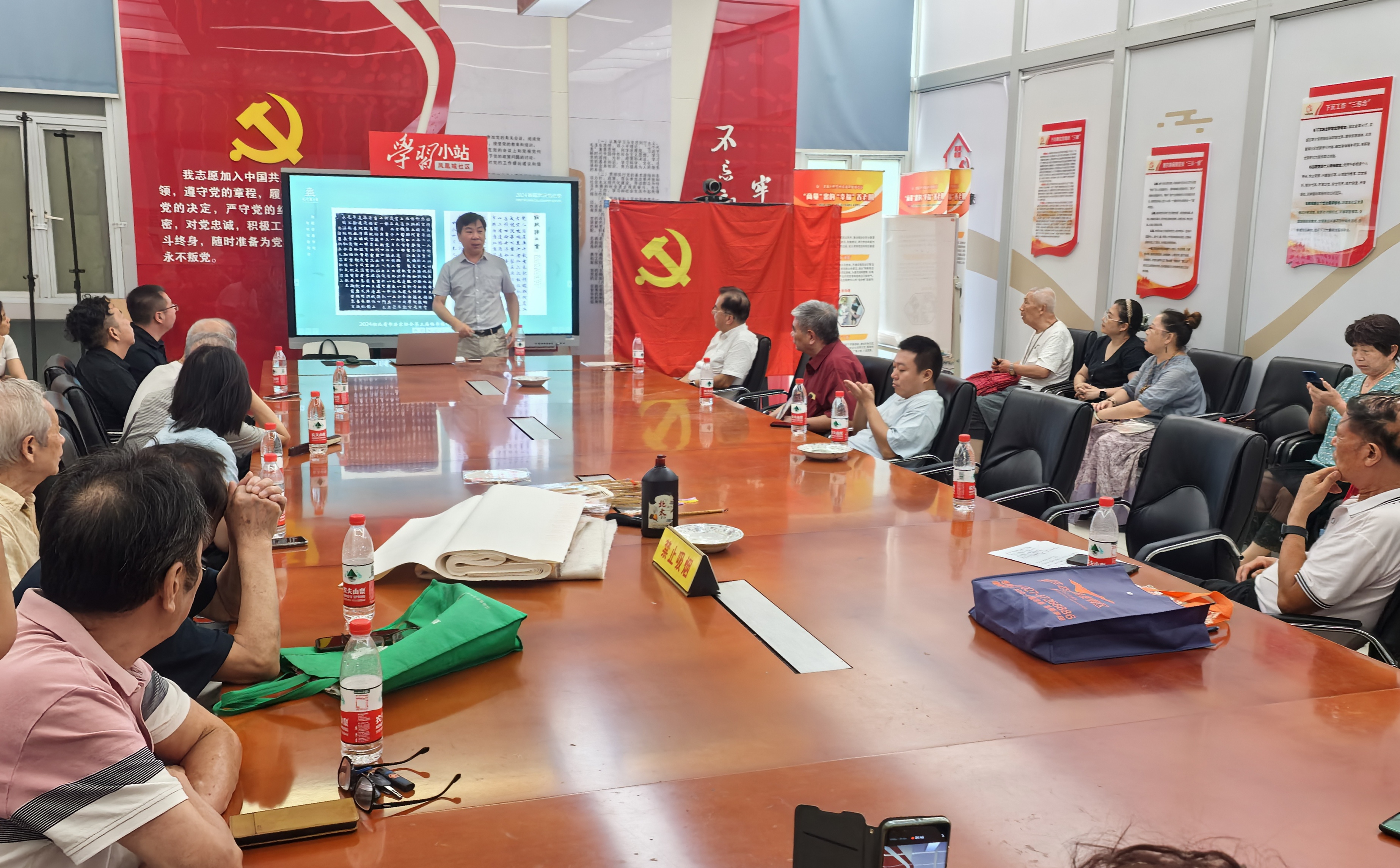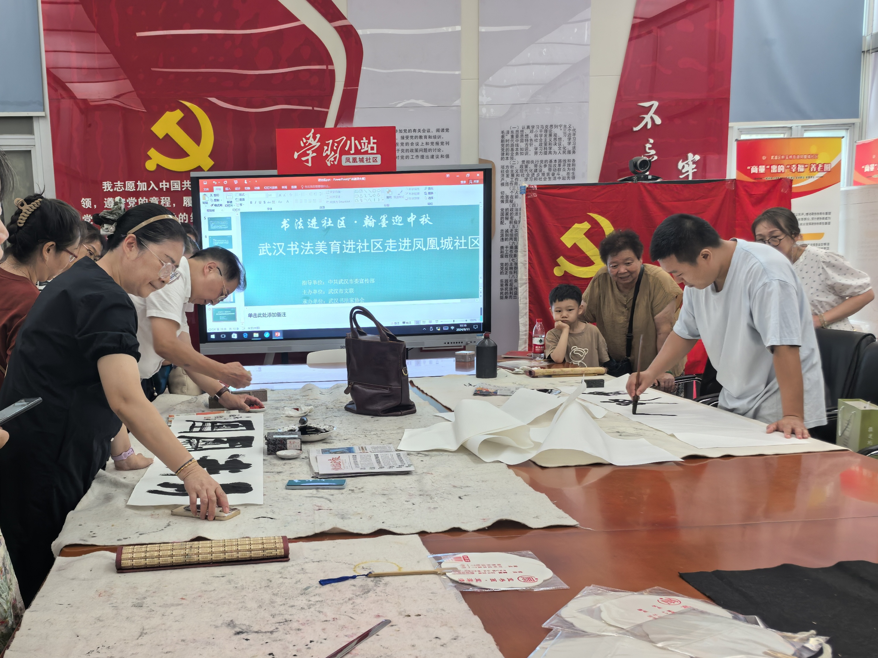 為了深入貫徹學習黨的二十屆三中全會精神,積極開展“藝心聚力,共同締造——書法美育進社區(qū)活動”,由武漢市委宣傳部指導,武漢市文聯(lián)、武漢書法家協(xié)會主辦,武昌區(qū)書畫協(xié)會、武昌鳳凰城社區(qū)、金鳳凰書畫院承辦的“藝心聚力,共同締造”——書法美育走進社區(qū)活動,9月11日在武昌區(qū)積玉橋街鳳凰城社區(qū)拉開帷幕。武漢書法家協(xié)會駐會副秘書長張凌厲、武漢書法家協(xié)會副主席秦元昌、武漢書法家協(xié)會主席團委員韓勇、武漢書法家協(xié)會理事陳俊、武昌區(qū)文聯(lián)副主席何海威、金鳳凰書畫院院長謝長才以及來自于街道社區(qū)的廣大書畫愛好者、社區(qū)干部37人參加了學習交流活動。