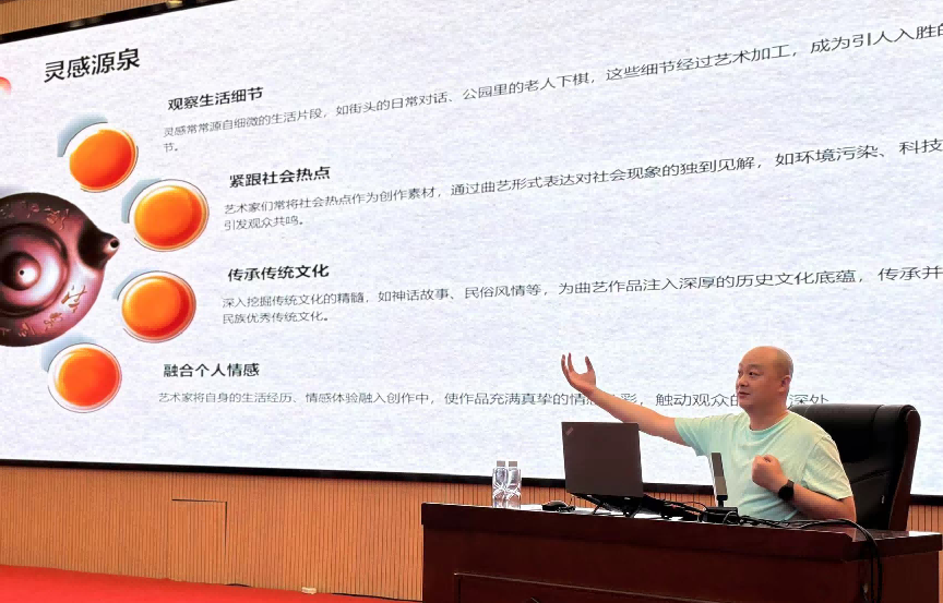 劉智鵬結(jié)合自身多年舞臺經(jīng)驗,傳授了曲藝類節(jié)目創(chuàng)作技巧和方法,分享了創(chuàng)作心理過程,還再現(xiàn)了經(jīng)典橋段表演?,F(xiàn)場學(xué)員反響強烈,紛紛表示受益匪淺。