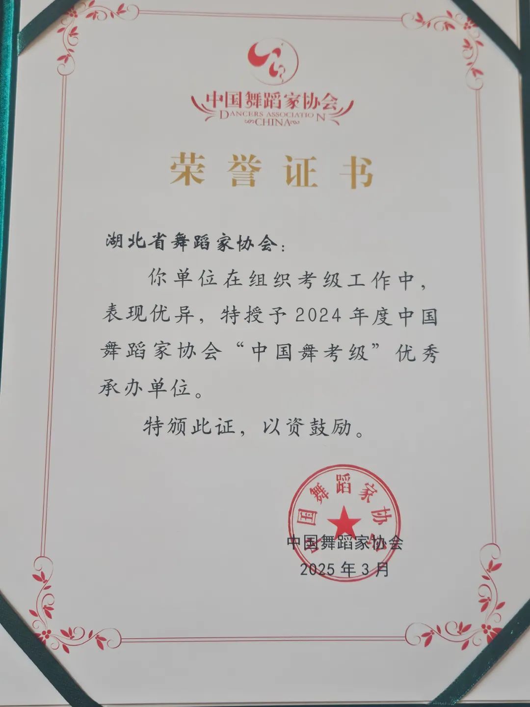 3月29日—4月3日,2025年中國舞蹈家協(xié)會全國考級工作會暨“中國舞考級”承辦單位負責人培訓班在重慶市舉辦。會上,湖北省舞協(xié)因在組織考級工作中表現(xiàn)優(yōu)異,被授予2024年度中國舞蹈家協(xié)會“中國舞考級”優(yōu)秀承辦單位榮譽稱號。
