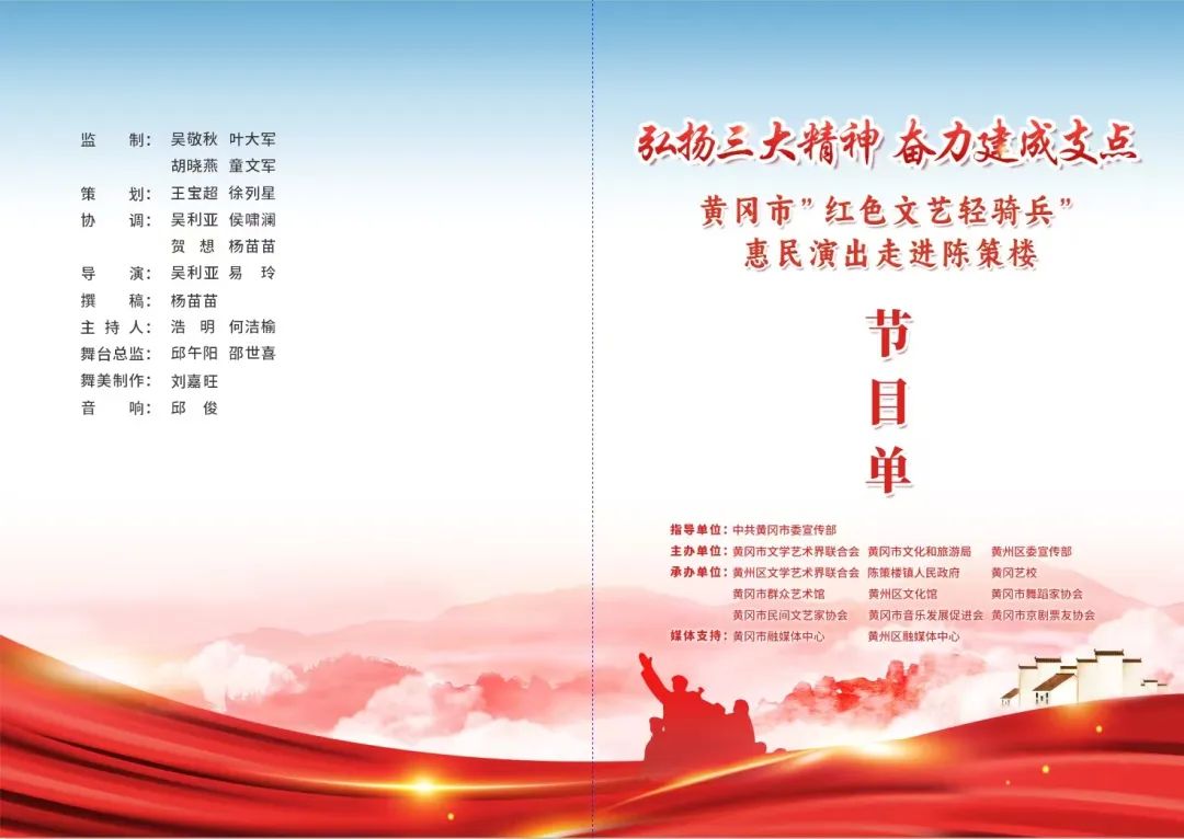 本次活動(dòng)由黃岡市委宣傳部指導(dǎo),黃岡市文聯(lián)、黃岡市文化和旅游局、黃州區(qū)委宣傳部主辦,黃州區(qū)文聯(lián)、陳策樓鎮(zhèn)人民政府、黃岡藝術(shù)學(xué)校、黃岡市群藝館、黃州區(qū)文化館、黃岡市舞蹈家協(xié)會(huì)、黃岡市民間文藝家協(xié)會(huì)、黃岡市音樂藝術(shù)發(fā)展促進(jìn)會(huì)、黃岡市京劇票友協(xié)會(huì)共同承辦。