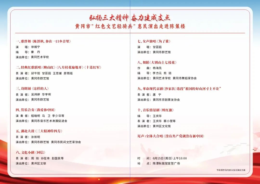 紅旗漫卷英雄地,三大精神映初心。6月15日上午,“弘揚(yáng)三大精神 奮力建成支點(diǎn)”黃岡市紅色文藝輕騎兵惠民演出在陳潭秋故居宣誓廣場(chǎng)舉行,為當(dāng)?shù)馗咐相l(xiāng)親獻(xiàn)上了一場(chǎng)精彩紛呈的文化盛宴。