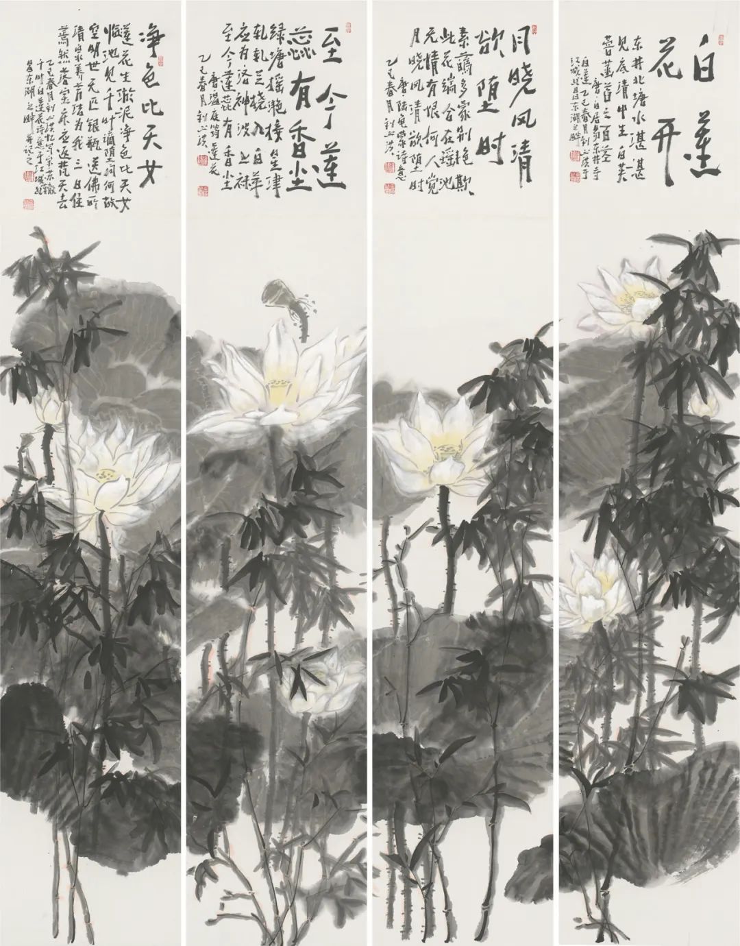 劉正洪 國畫 白蓮花開 178cm×34cm×4 2025年