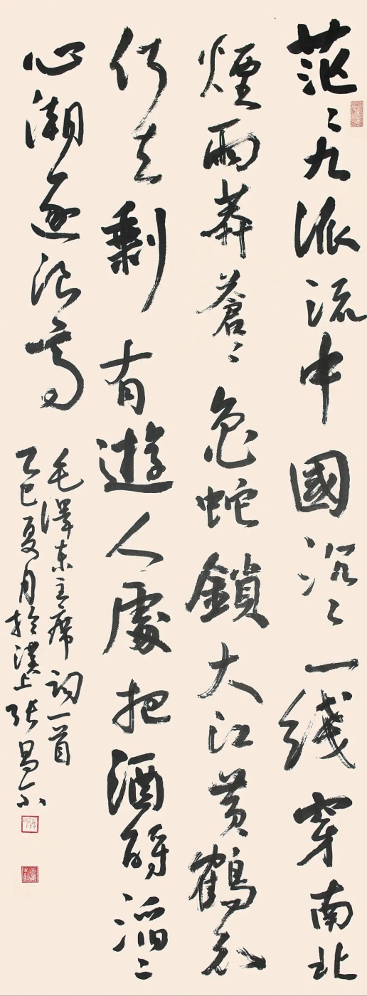 才飲長沙水, 又食武昌魚。 萬里長江橫渡, 極目楚天舒。 不管風(fēng)吹浪打, 勝似閑庭信步, 今日得寬余。 子在川上曰:逝者如斯夫!風(fēng)檣動, 龜蛇靜, 起宏圖。