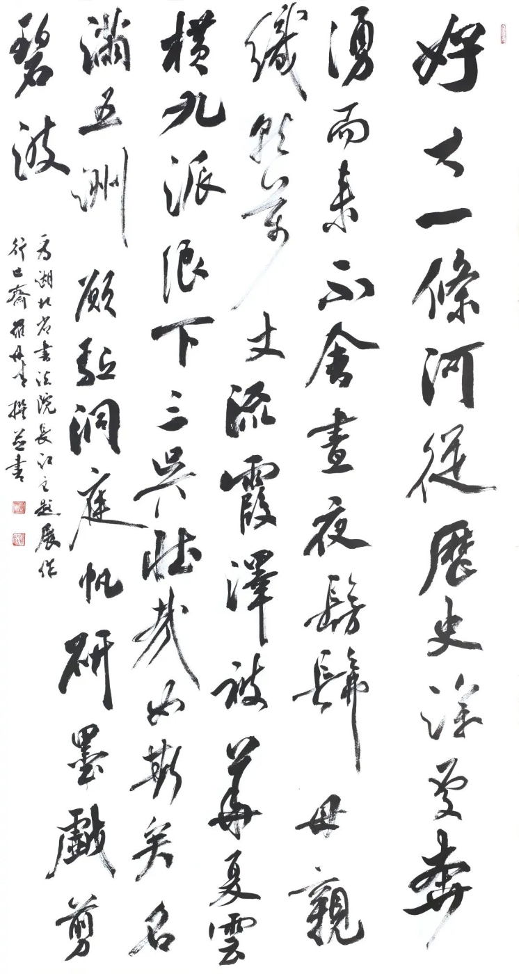 好大一條河, 從歷史深處奔涌而來,不舍晝夜, 仿佛母親織就萬丈流霞,澤被華夏, 云橫九派, 浪下三吳, 壯哉如斯矣, 名滿五洲, 愿馭洞庭帆, 研墨戲剪碧波。