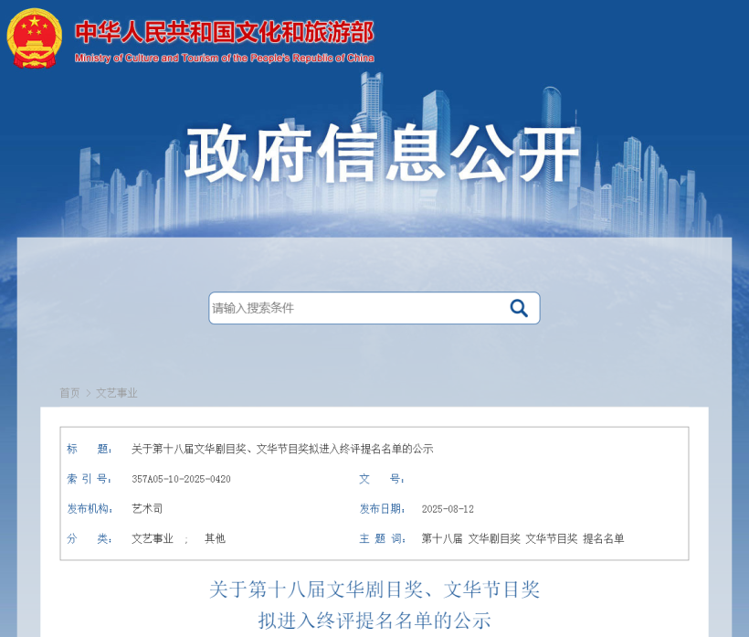 根據(jù)《文華獎(jiǎng)?wù)鲁獭贰兜谑藢梦娜A獎(jiǎng)評(píng)獎(jiǎng)辦法》有關(guān)規(guī)定,現(xiàn)將第十八屆文華劇目獎(jiǎng)、文華節(jié)目獎(jiǎng)擬進(jìn)入終評(píng)提名名單進(jìn)行公示。