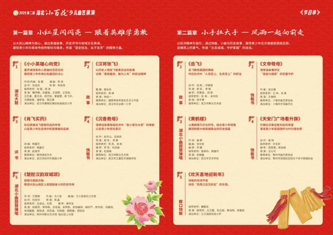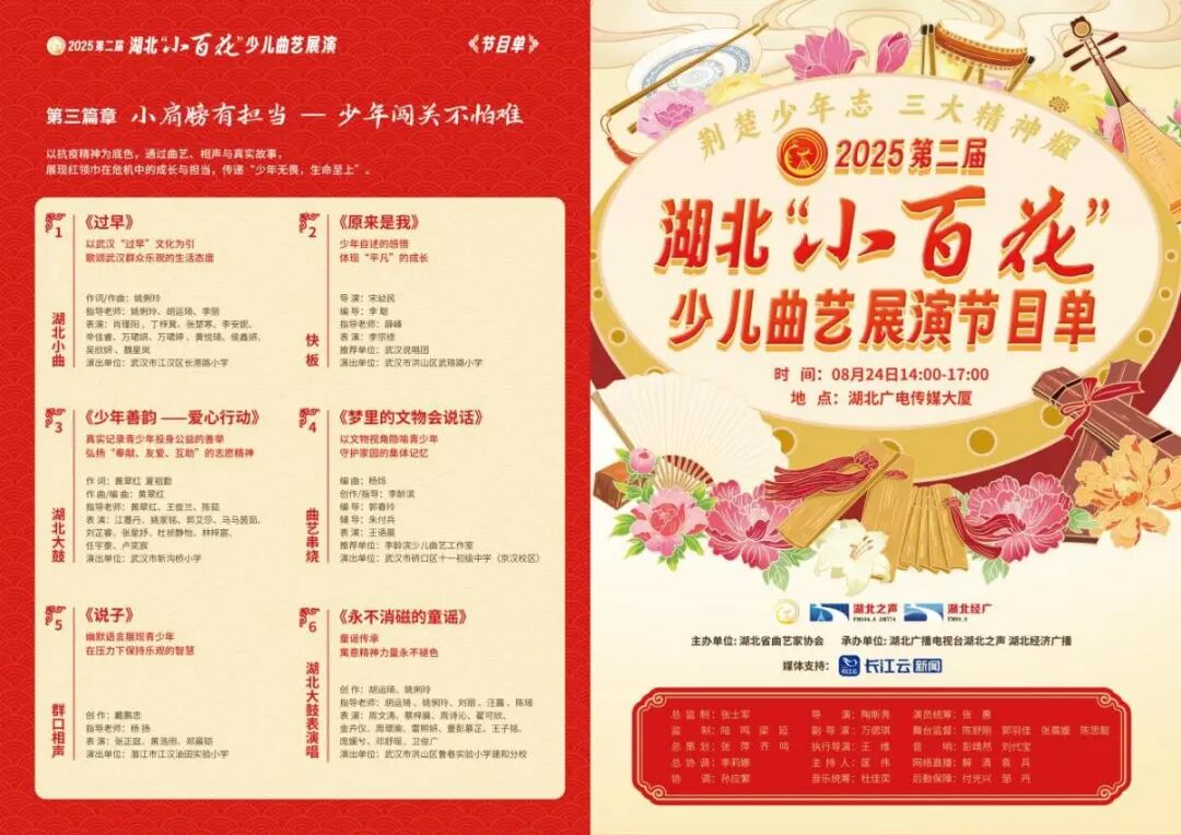 8月24日,以“荊楚少年志 三大精神耀”為主題的第二屆湖北“小百花”少兒曲藝展演在湖北廣電傳媒基地精彩開(kāi)鑼。16部凝聚童心與匠心的原創(chuàng)曲藝作品輪番登臺(tái),通過(guò)湖北大鼓、小曲、評(píng)書(shū)、快板、相聲等多元形式,將大別山精神、抗洪精神、抗疫精神融入曲藝表達(dá),展現(xiàn)新時(shí)代荊楚少年對(duì)紅色基因的傳承與創(chuàng)新?;顒?dòng)由湖北省曲藝家協(xié)會(huì)主辦,湖北之聲、湖北經(jīng)濟(jì)廣播承辦,吸引全省178件作品參與海選,最終30部佳作入圍復(fù)試,16個(gè)節(jié)目登臺(tái)展演,線(xiàn)上線(xiàn)下覆蓋觀眾超50萬(wàn)+人次。