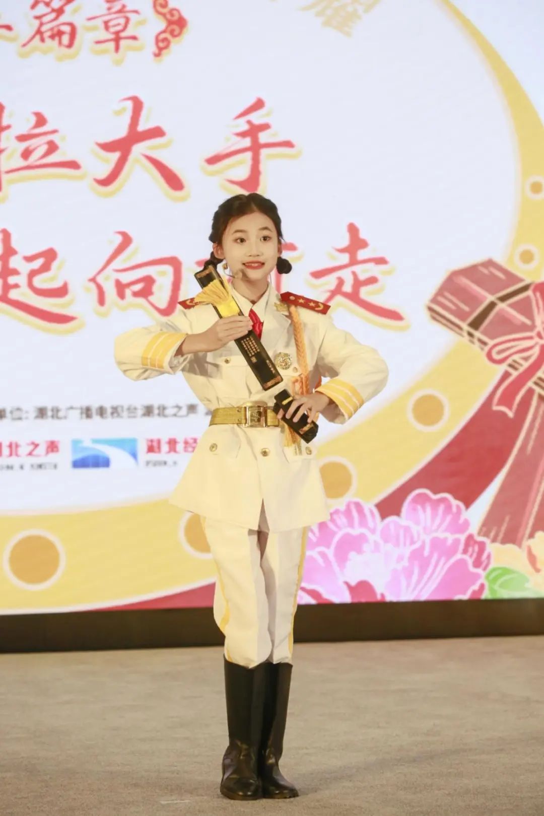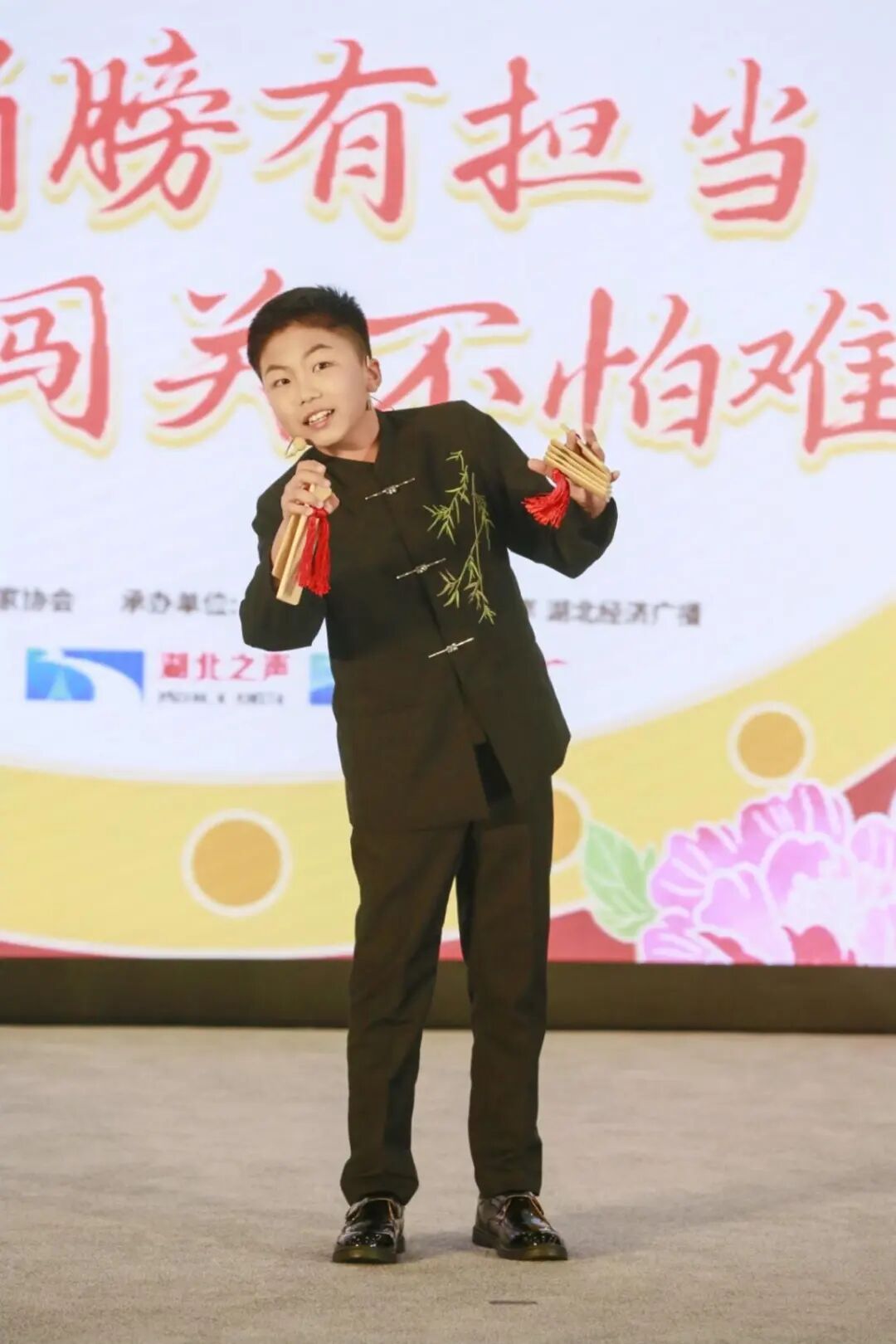首篇《小小英雄心向黨》以湖北大鼓再現(xiàn)少年王二小引敵入伏的英勇事跡,稚嫩童聲與鏗鏘鼓點(diǎn)交織,點(diǎn)燃全場(chǎng)愛(ài)國(guó)熱情;評(píng)書(shū)《肖飛買(mǎi)藥》中,小演員以抑揚(yáng)頓挫的語(yǔ)調(diào)還原抗日英雄智取藥品的驚險(xiǎn)瞬間,贏得陣陣掌聲;快板書(shū)《沉香救母》則通過(guò)傳統(tǒng)曲藝演繹孝道文化,傳遞“舍小家為大家”的家國(guó)情懷。