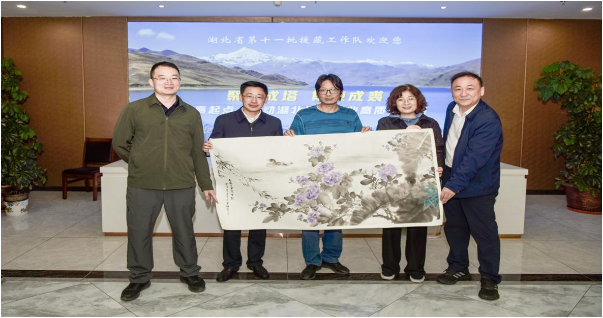 26日晚,結(jié)束白天的密集培訓(xùn)和參觀后,湖北文聯(lián)代表團一行來到山南湖北援藏家園。在湖北援藏成就陳列室,一幅幅新舊對比照片、一排排產(chǎn)業(yè)援藏成果、一段段民族團結(jié)故事映入眼簾——從“三湘大道”到“湖北大道” ,一條條道路見證“山南山北不再遙遠”;從“雅江兩岸蔬菜棚”到“高原水廠”,一項項民生工程托起“穩(wěn)穩(wěn)的幸?!?;從“組團式醫(yī)療”到“組團式教育”,一批批湖北援藏干部把“荊楚溫度”送到雪域高原。湖北援藏工作隊員用一組組數(shù)據(jù)、一個個故事,講述湖北援藏人如何以鑄牢中華民族共同體意識為主線,全方位、多層次、寬領(lǐng)域支援山南經(jīng)濟社會高質(zhì)量發(fā)展。深受感動的湖北文藝家們向奮戰(zhàn)在青藏高原的湖北省第十一批援藏工作隊贈送了精心創(chuàng)作的書畫作品,用翰墨丹青致敬“雪域筑路人”,讓長江深情與高原堅守交相輝映。