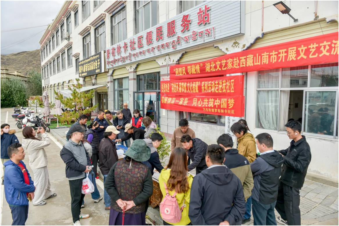 27日上午,西藏自治區(qū)山南市乃東區(qū)羅布林卡社區(qū)廣場早早掛起“鄂藏情深一家親 同心共筑中國夢”的大紅橫幅和標語。湖北省文聯(lián)與山南市書協(xié)的藝術(shù)家共同抵達后,長桌一字排開、氈墊鋪陳,墨香與糌粑香一起飄滿廣場。藝術(shù)家們以筆為媒,以墨為友,藏文書法“扎西德勒”、漢字書法“家和萬事興”、中國畫作品《貢布山前浮云動》……每一幅作品都書寫著人民群眾對美好生活的向往。整整兩個多小時,藝術(shù)家們現(xiàn)場創(chuàng)作的近百幅書法、國畫作品被熱心的群眾“認領(lǐng)”一空。在最熱鬧的“交流互動區(qū)”,當(dāng)湖北畫家童建鋼在山南市書協(xié)洛桑次仁老師的指導(dǎo)下,用藏文完成“扎西德勒”的書法創(chuàng)作時,圍觀的社區(qū)居民忍不住齊聲叫好,鄂藏情在筆尖與笑臉中持續(xù)升溫……