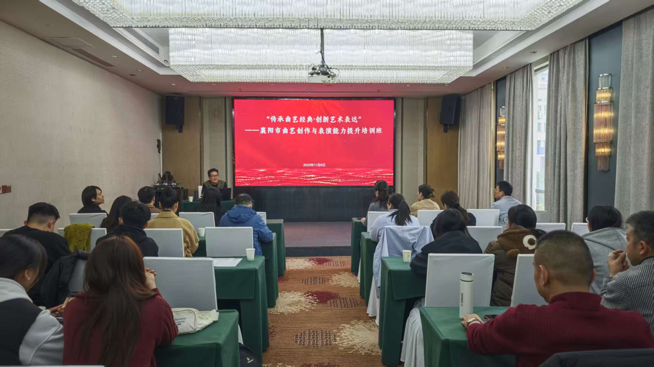 11月8日,由襄陽市文聯(lián)指導(dǎo)、襄陽市曲藝家協(xié)會主辦的“傳承曲藝經(jīng)典·創(chuàng)新藝術(shù)表達(dá)”——襄陽市曲藝創(chuàng)作與表演能力提升培訓(xùn)班舉行。湖北省曲藝家協(xié)會副主席、副研究館員李四順,湖北省曲藝家協(xié)會理事、二級演員劉智鵬受邀前來授課,全市40余名曲藝從業(yè)者及愛好者參加培訓(xùn)。