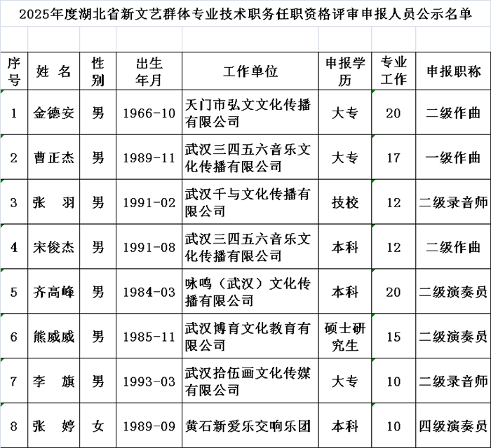 附件:2025年度湖北省新文藝群體專(zhuān)業(yè)技術(shù)職務(wù)任職資格評(píng)審申報(bào)人員公示名單