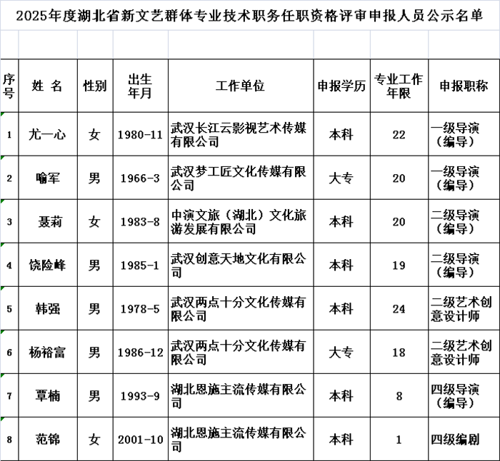 附件:2025年度湖北省新文藝群體專業(yè)技術職務任職資格評審申報人員公示名單