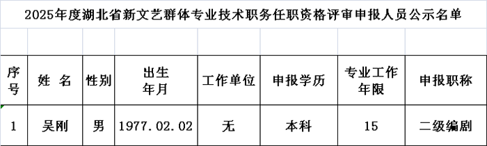 附件:2025年度湖北省新文藝群體專業(yè)技術(shù)職務(wù)任職資格評審申報人員公示名單