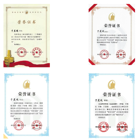 2023年10月?lián)胃枨读羷τ⑿邸纷髑@2023年湖北省“村村有歌”鄉(xiāng)村振興主題原創(chuàng)歌曲優(yōu)秀獎。