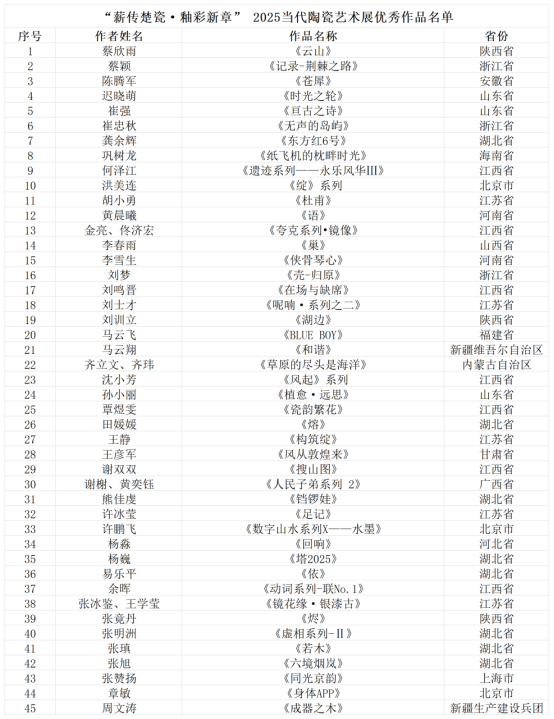 由湖北省美術(shù)家協(xié)會(huì)和武漢科技大學(xué)主辦的“薪傳楚瓷·釉彩新章”2025當(dāng)代陶瓷藝術(shù)展,自啟動(dòng)征稿以來,共收到全國各界藝術(shù)創(chuàng)作者投稿作品600余件。經(jīng)展覽評審委員會(huì)嚴(yán)謹(jǐn)、公正的初評,共有220件作品進(jìn)入復(fù)評環(huán)節(jié),并最終確定45件優(yōu)秀作品。現(xiàn)將復(fù)評優(yōu)秀作品名單予以公示。