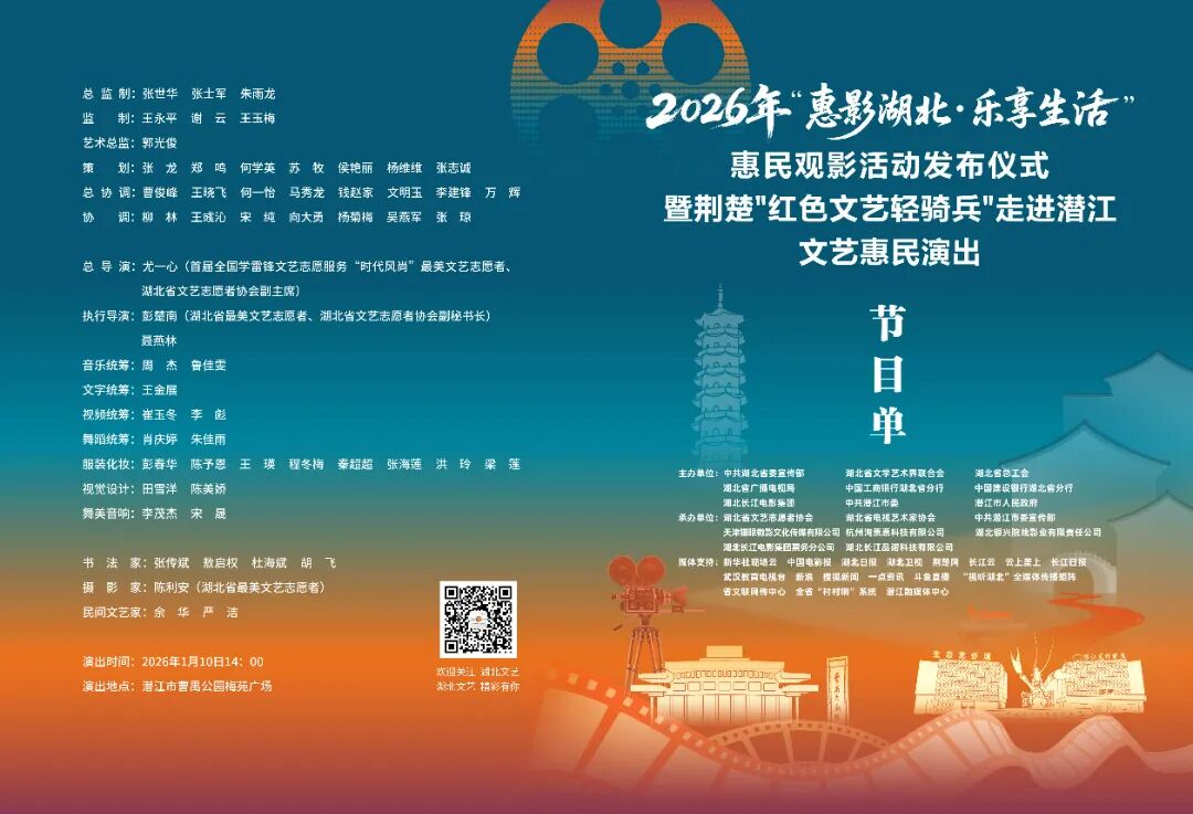 2026年1月10日下午,潛江市曹禺公園梅苑廣場洋溢著喜慶氛圍,荊楚“紅色文藝輕騎兵”文藝惠民演出在潛江市曹禺公園梅苑廣場舉辦,現(xiàn)場同步舉辦2026年“惠影湖北·樂享生活”惠民觀影活動發(fā)布儀式,標志著今年我省電影惠民工程正式拉開帷幕,活動以光影為媒,將文化盛宴送到群眾身邊。